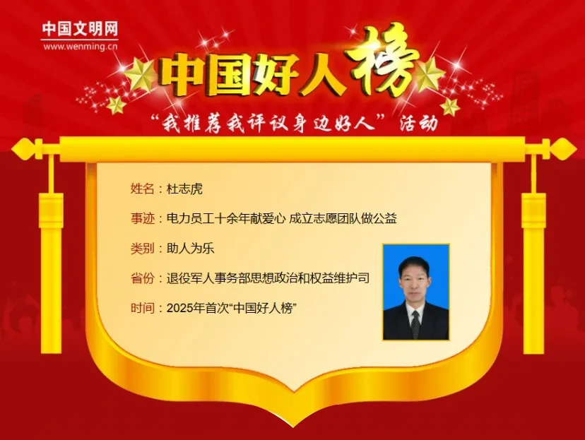 6月24日,2025年首次“中国好人榜”发布仪式暨全国道德模范与身边好人现场交流活动在河南省安阳市举办。经各地推荐、网友评议和专家评审等环节,共有152人(组)助人为乐、见义勇为、诚实守信、敬业奉献、孝老爱亲身边好人光荣上榜。武威市杜志虎上榜。