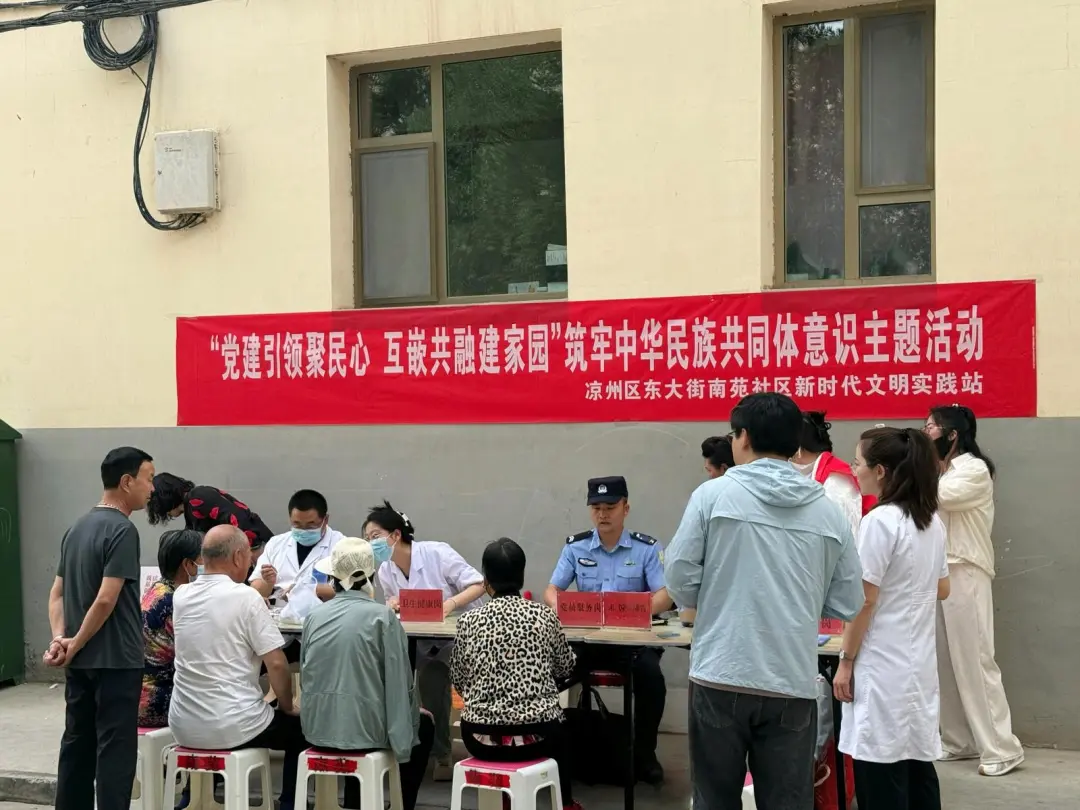 为深入贯彻落实党的民族理论政策,进一步增强各族群众的中华民族共同体意识,凝心聚力共建和谐社会,7月4日下午,凉州区东大街南苑社区以“党建引领聚民心 互嵌共融建家园”为主题,开展铸牢中华民族共同体意识系列活动。活动以理论学习筑牢思想根基,通过政策宣讲普及民族知识,依托健康服务传递民生关怀,借助文化体验促进情感共鸣,全方位、多层次营造出“中华民族一家亲,同心共筑中国梦”的浓厚氛围,切实将党建引领优势转化为民族团结进步的生动实践。