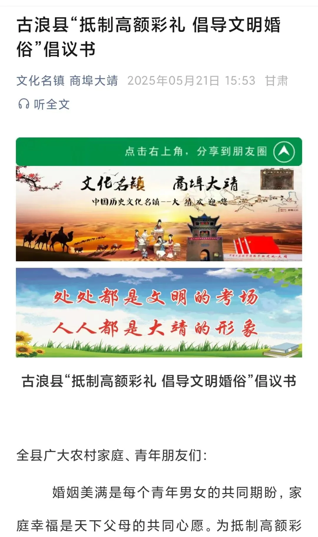 近日,古浪县大靖镇聚焦农村高额彩礼问题综合治理,以“党建引领、宣传赋能、制度固本、示范带动”四维联动,构建起全方位、多层次的治理体系,全力推进农村高额彩礼问题综合治理工作,让文明新风如春风化雨般浸润千家万户,为乡村振兴注入精神动力。