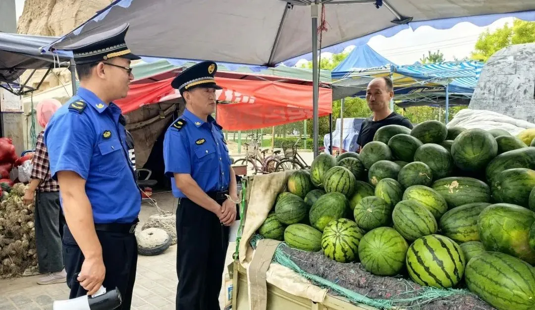 盛夏时节,瓜果飘香。随着应季瓜果大量上市,民勤县城市管理综合行政执法队主动作为,聚焦瓜果摊点运营规范与安全保障开展监督检查,切实解决农户售卖难与群众购买便的民生问题。