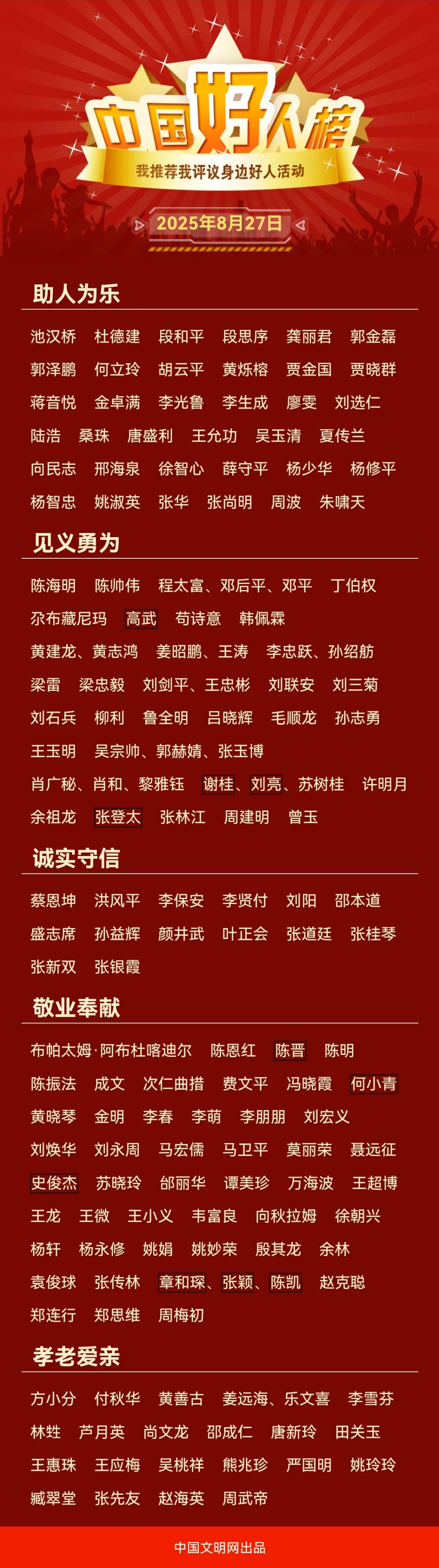 2025年第二次中国好人榜发布仪式暨全国道德模范与身边好人现场交流活动8月27日在黑龙江省伊春市溪水林场举办。经各地推荐、网友评议和专家评审等环节,共有150人(组)助人为乐、见义勇为、诚实守信、敬业奉献、孝老爱亲身边好人光荣上榜。
